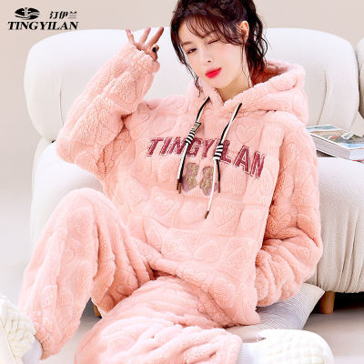 2024秋冬新款睡衣女加绒加厚珊瑚绒外出细绒大码睡衣外穿宽松连帽