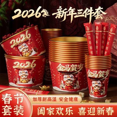 2026马年一次性金箔纸碗纸杯筷子加厚一次性碗杯子一次性餐具套装