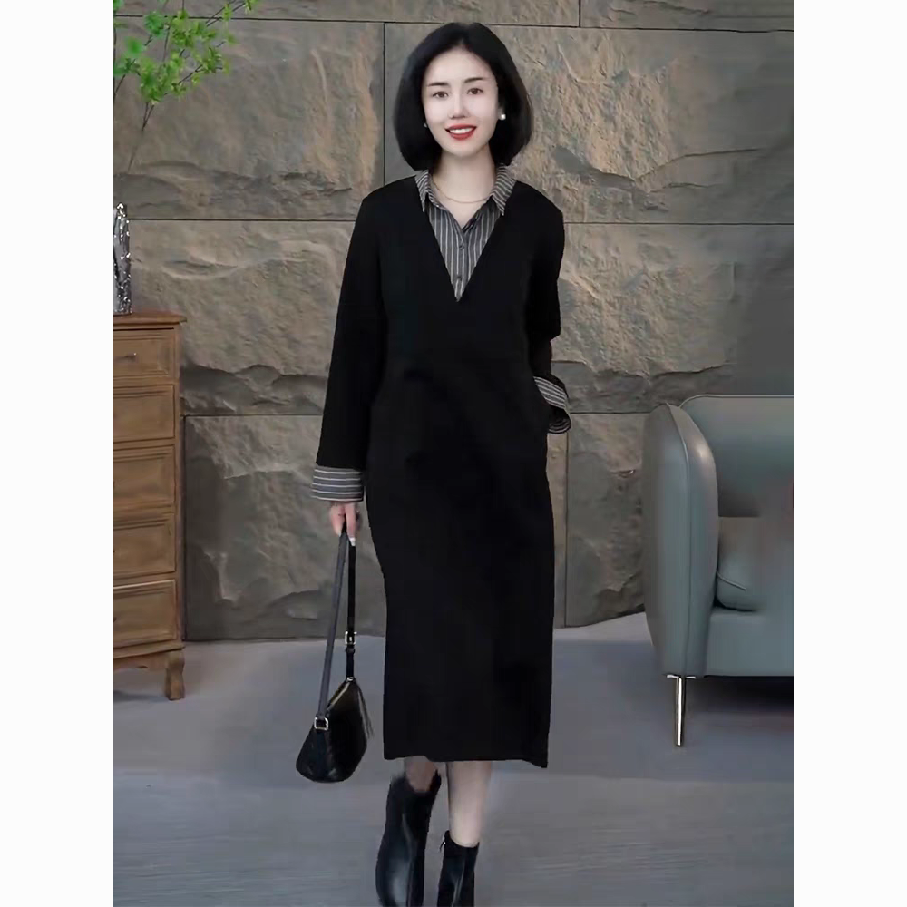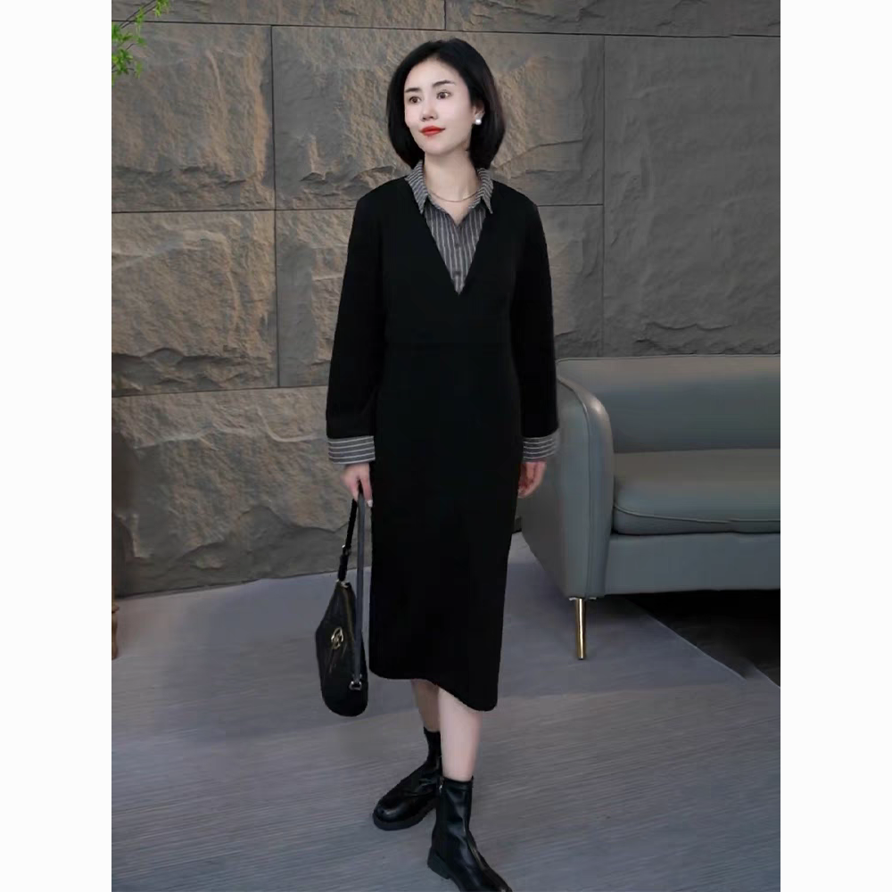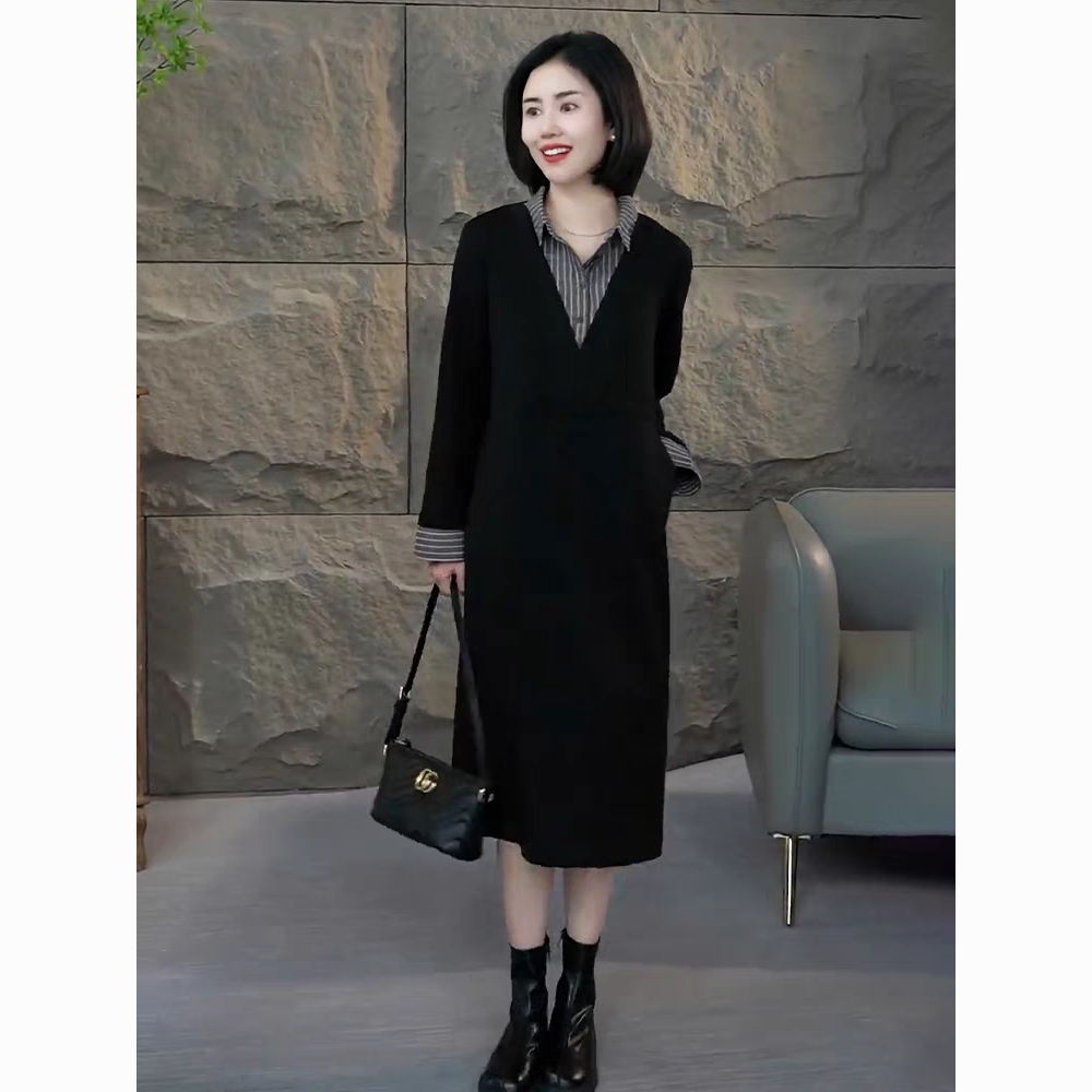 春秋季连衣裙女2025新款条纹拼接假两件百搭休闲宽松气质长裙子