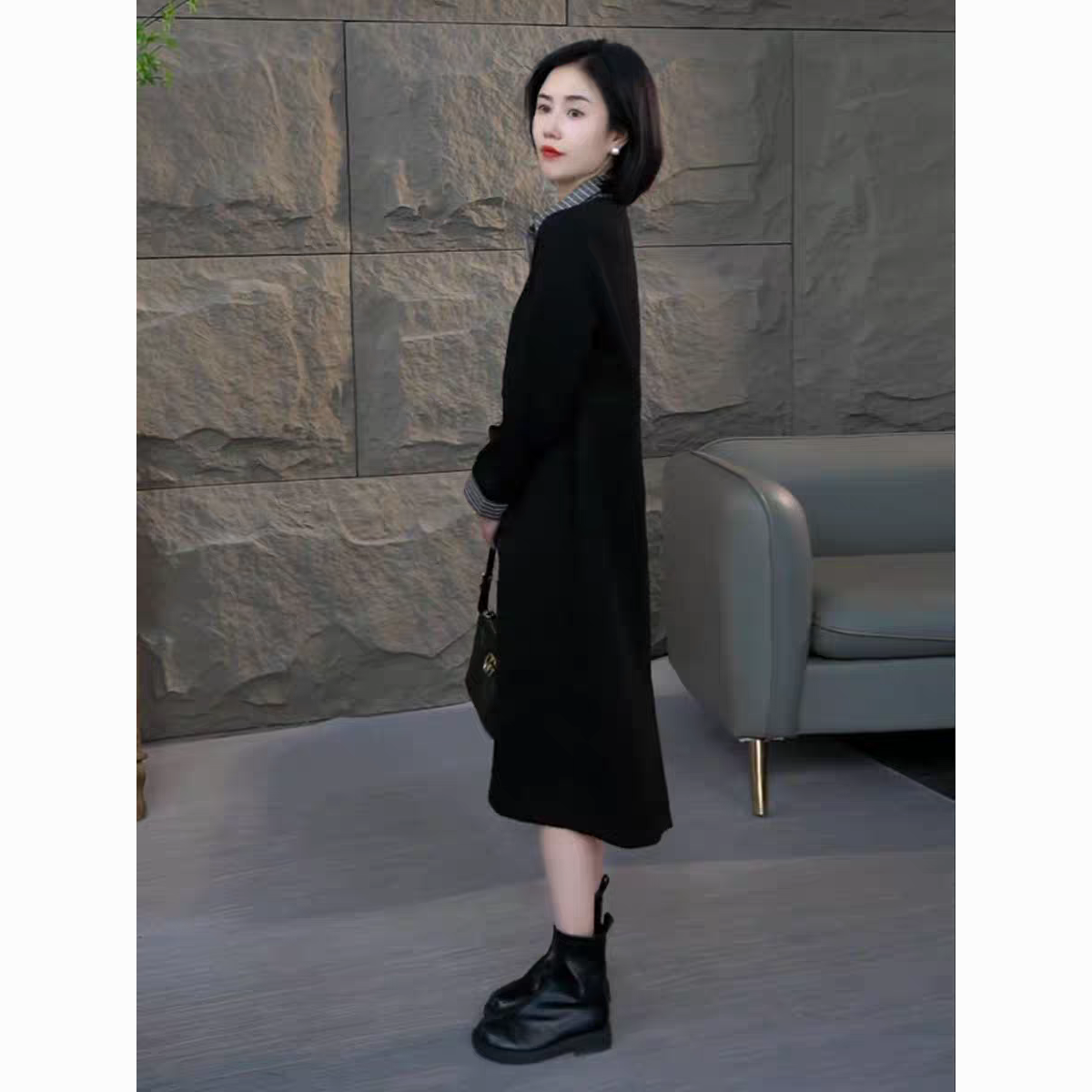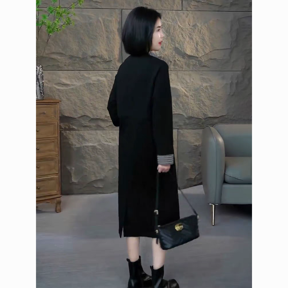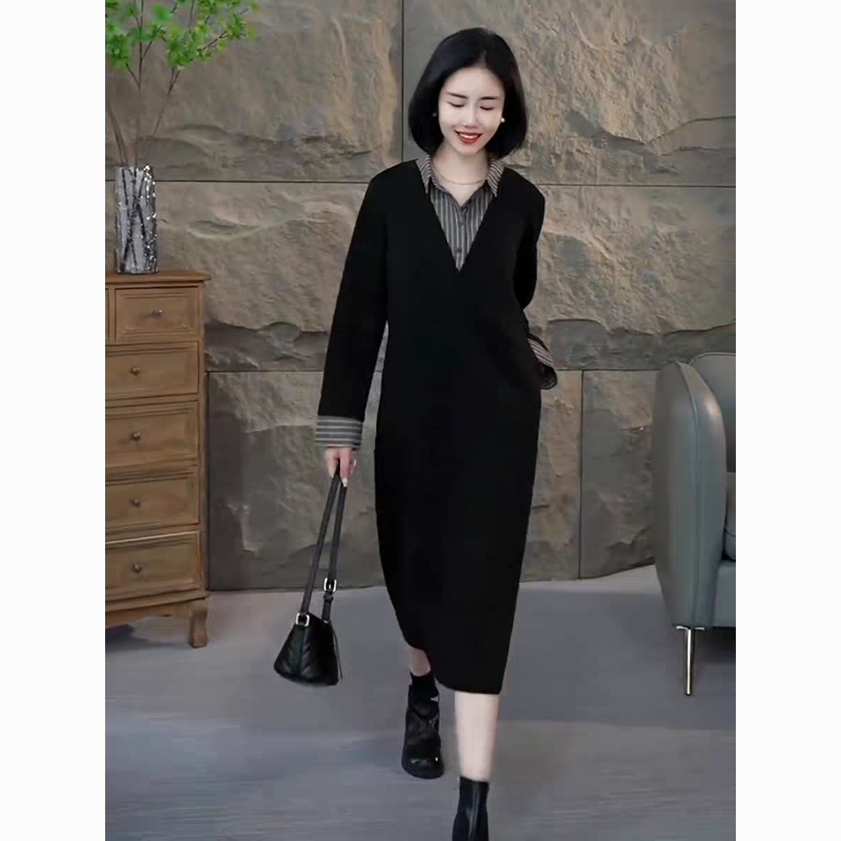 春秋季连衣裙女2025新款条纹拼接假两件百搭休闲宽松气质长裙子