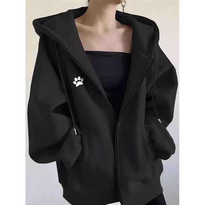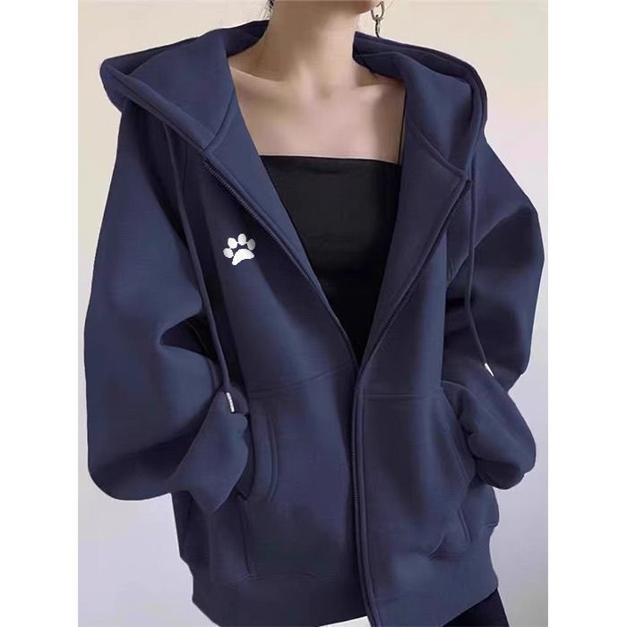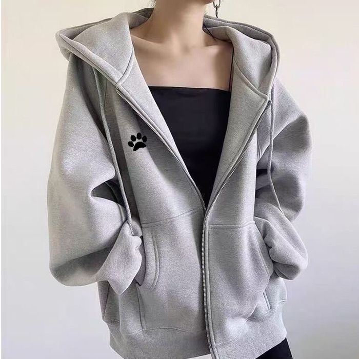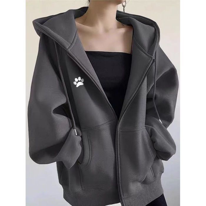 灰色连帽卫衣外套女秋冬宽松外套韩版慵懒高级感连帽加绒加厚开衫