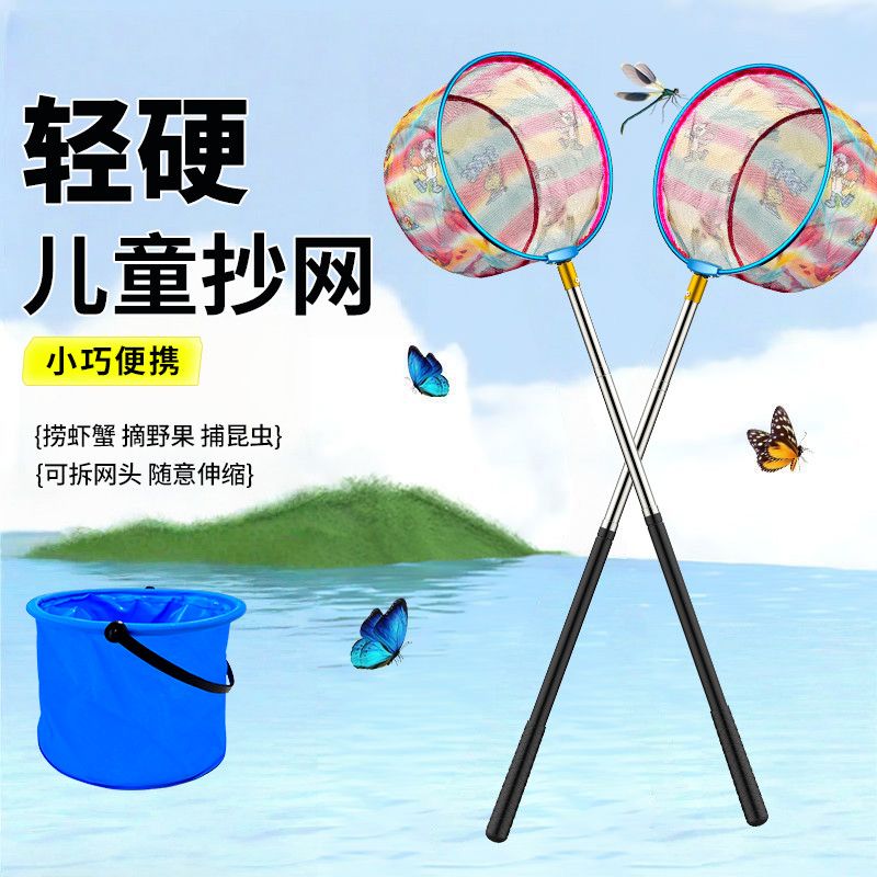 杰诺全套儿童抄网捞鱼网兜一体式伸缩碳素抄网杆超轻捞小鱼折叠桶