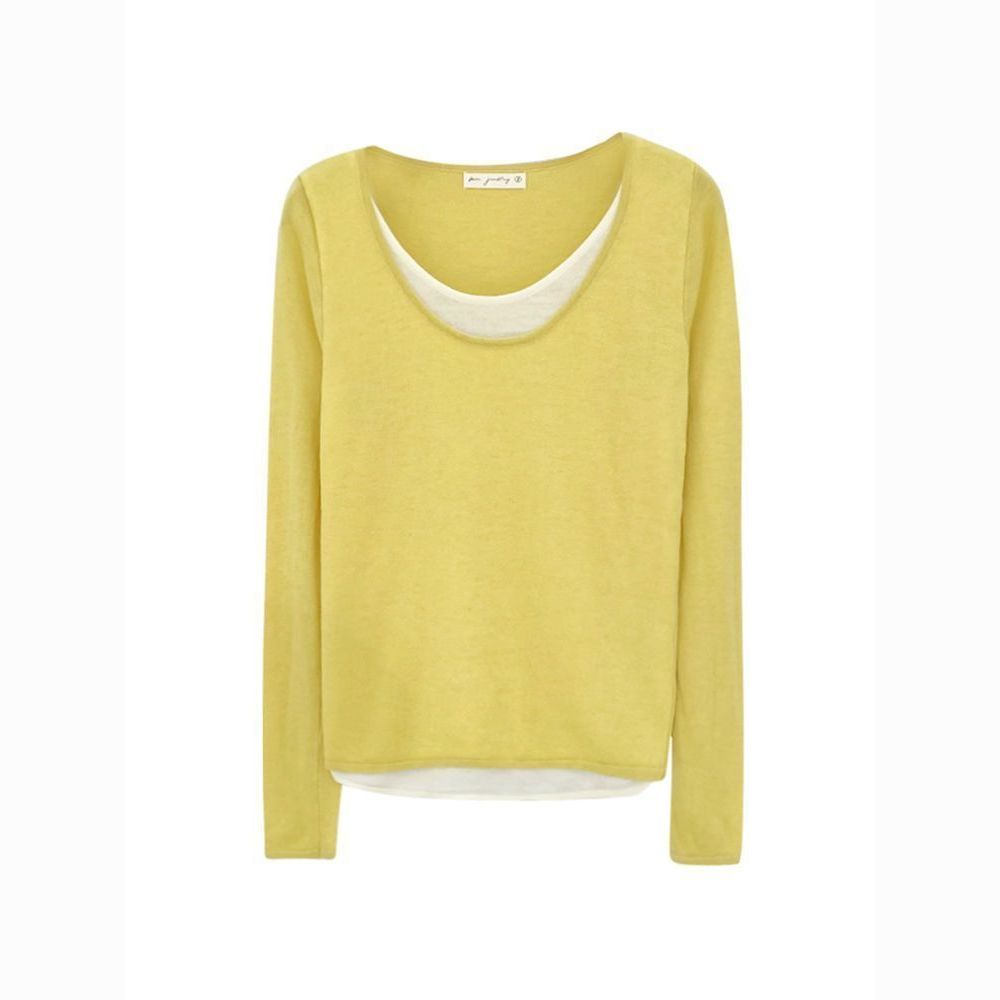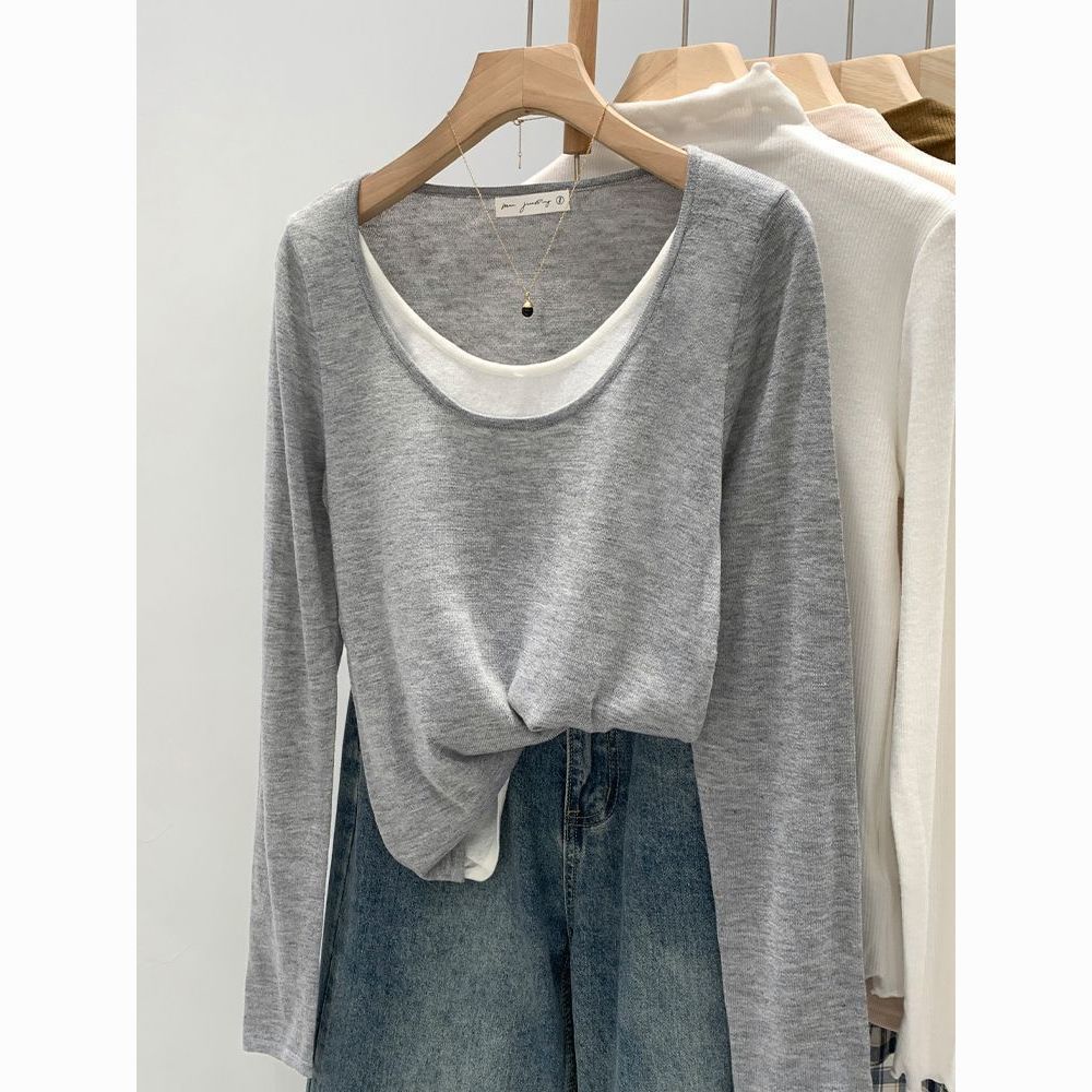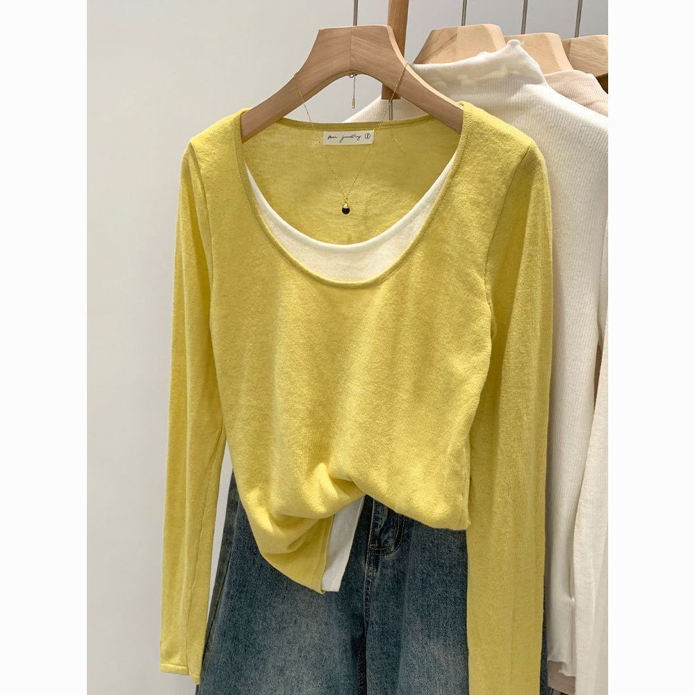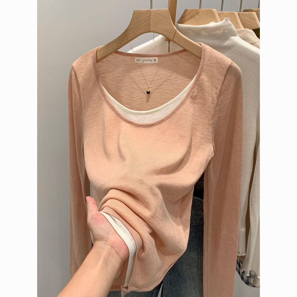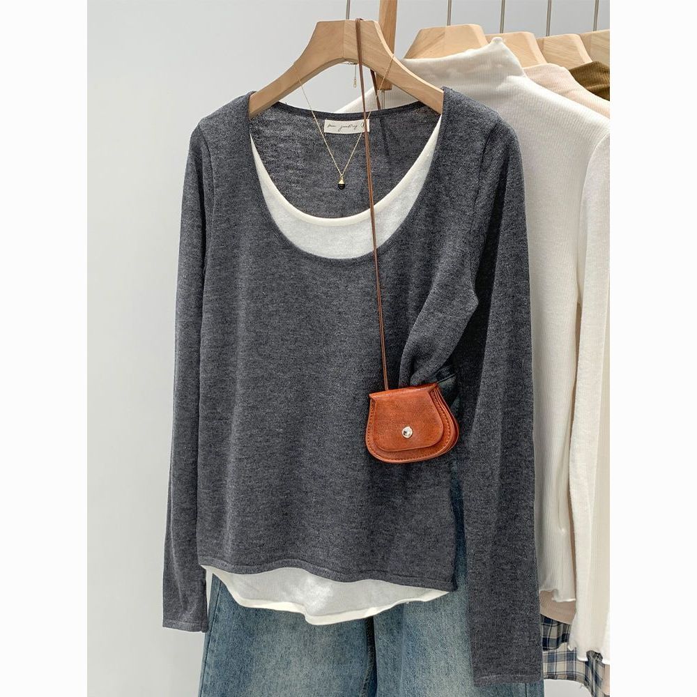 撞色假两件针织打底衫女春秋大码女装胖mm内搭宽松慵懒松弛感上衣