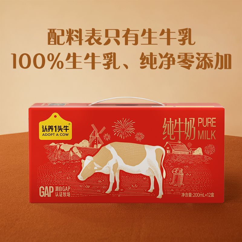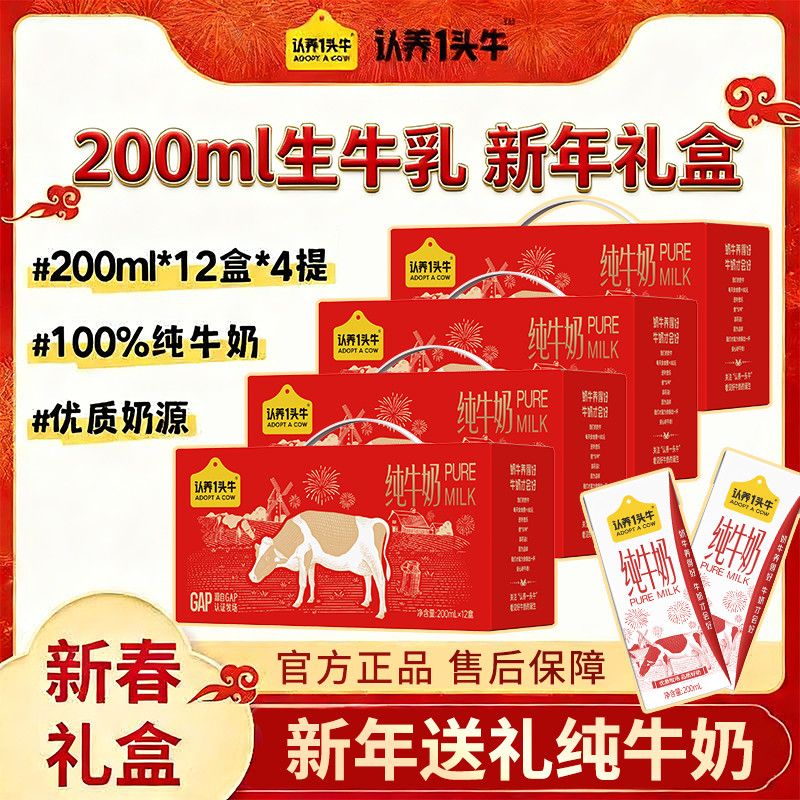 4箱送礼认养一头牛纯牛奶200ml*12盒*4箱牛奶红色礼盒春节新款
